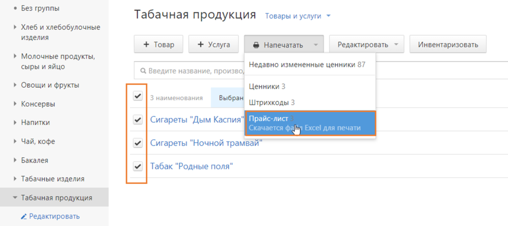 Контур.Маркет помогает выполнить это требование. Вы можете скачать из сервиса прайс в формате Excel и отправить на печать: